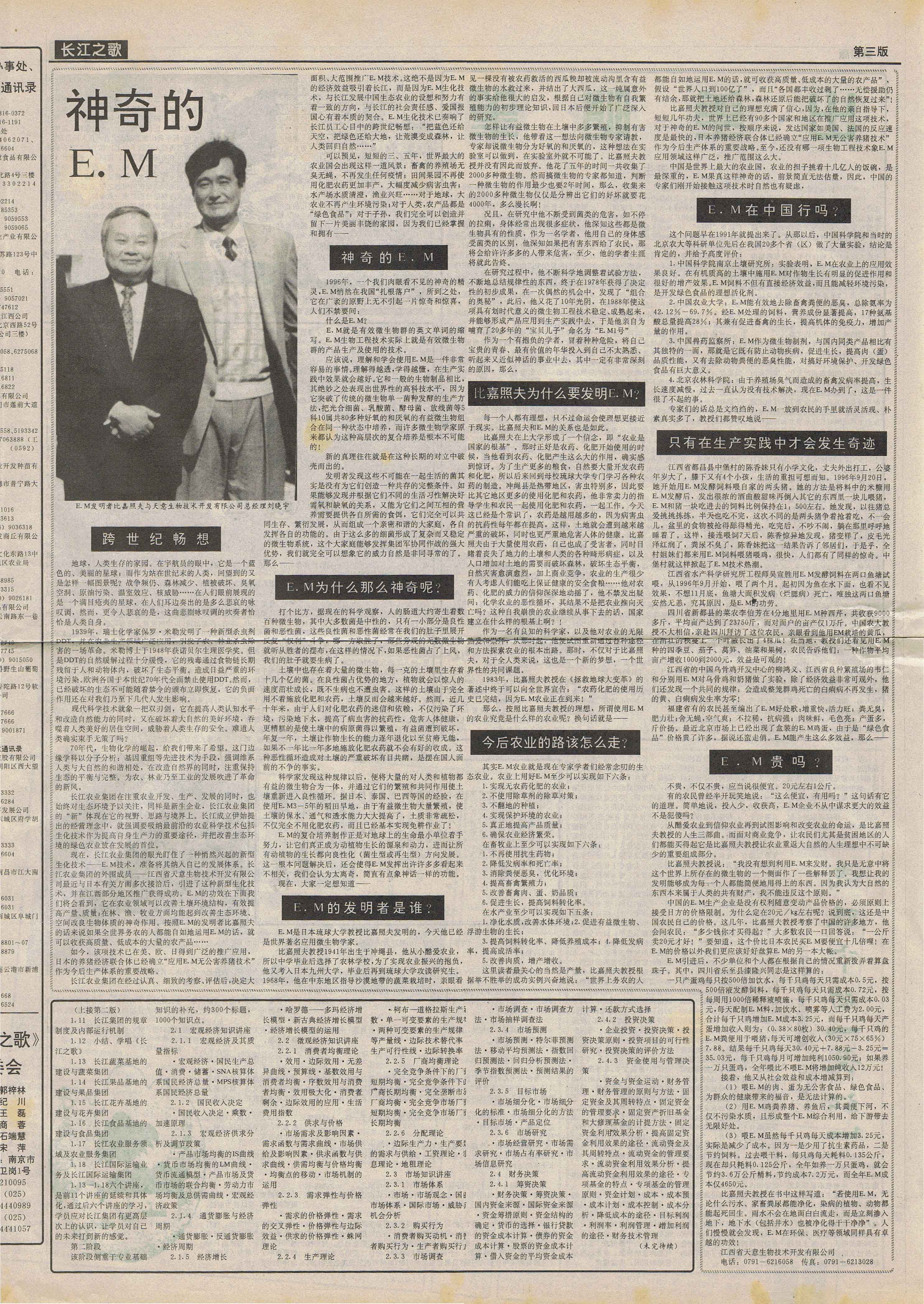 1997 1997年,継《中國畜牧水產報》、《科技日報》、《經濟參考報》、《江西日報》等媒體發表長篇通訊《EM原露正在改變世界》,各省科技、農業報刋均紛紛轉載,EM原露在江西最初的使用效果迅速在全國范圍內興起了一股熱潮,兩年內共簽定縣級代理合同500余家。